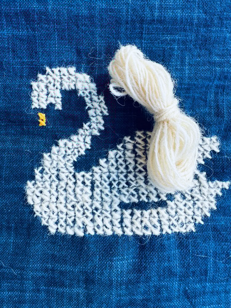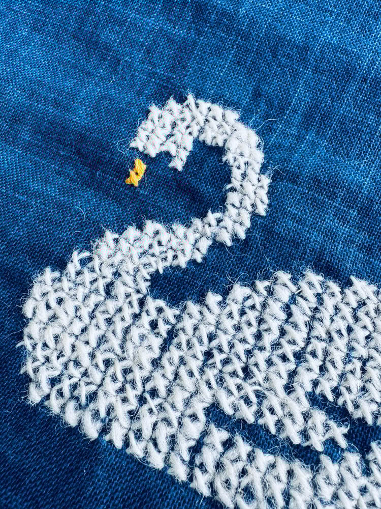 Swan pattern designed by Aitor Saraiba for cross-stitch embroidery. This kit includes wool from Aitor Saraiba’s free-roaming sheep, traditionally sheared and entirely processed in Spain. Cross-stitching with wool adds a vintage and very special touch. This design will look perfect on your sweater, jacket, bag, or wherever you like most.